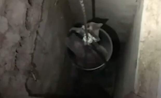 Для ее спасения туда опустили ведро с кормом — кошка в него забралась, и ее вытащили из заточения.