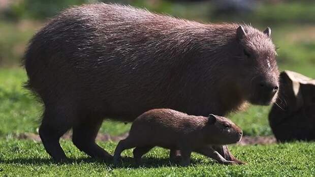 В Англии в Честерском зоопарке родился детеныш капибары. На видео, снятом сотрудниками зоопарка, малыш бегает за своей мамой по кличке Лили.