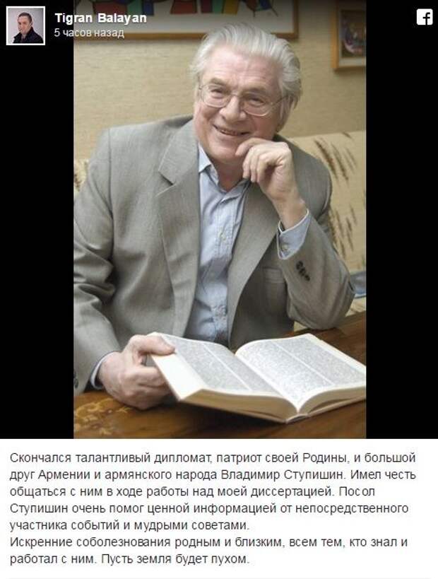 В возрасте 84 лет скончался бывший посол РФ в Армении Владимир Ступишин. Об этом сообщает пресс-секретарь армянского внешнеполитического ведомства Тигран Балаян.