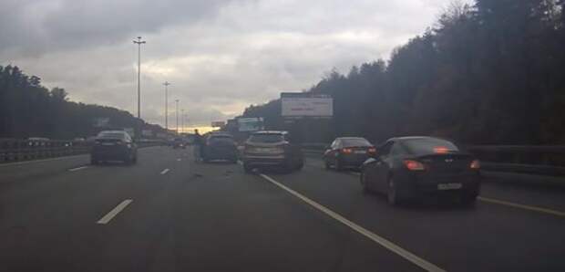 Видеорегистратор легковушки зафиксировал момент массового ДТП на Киевском шоссе в Москве. На кадрах записи видно, как на дороге столкнулось несколько иномарок.