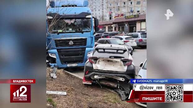 Во Владивостоке водитель фуры устроил массовую аварию и протаранил сразу пять припаркованных машин. Легковушки, на которые пришелся основной удар, оказались раздавлены.