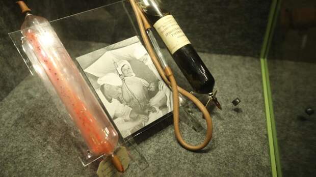 Эта легендарная "полуторка" вывезла из блокадного Ленинграда более 20 тысяч больных и раненых.Еще один уникальный экспонат – образец законсервированной крови, которую ленинградцы в годы ВОВ сдали для спасения солдат. Именно жители осажденного Петербурга в годы войны обеспечивали 20% всей донорской крови для фронта. Желающих сдать кровь в блокадном городе было так много, что не хватало специализированной посуды для сбора материала. Тогда сотрудники Института переливания крови разработали особую методику по закупорке и дезинфекции, которая позволяла использовать нестандартные емкости.