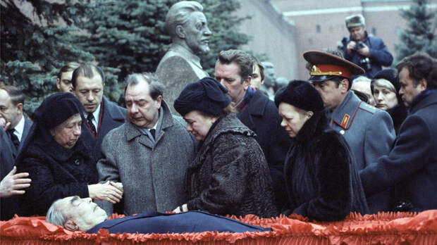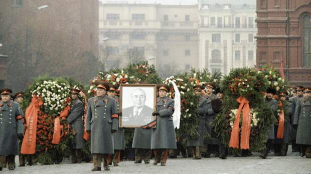Траурная процессия на Красной площади во время похорон Генерального секретаря ЦК КПСС, Председателя Президиума Верховного Совета СССР Леонида Ильича Брежнева. РИА Новости/Юрий Сомов Похороны Брежнева транслировались по телевидению. В последний путь Леонида Ильича провожали залпами башенных орудий. Это были многократные холостые выстрелы артиллеристов батареи кремлевского гарнизона. Первый залп прозвучал, когда гроб опускали в могилу. Ходили слухи, что в тот самый момент веревки у изголовья сорвались, и гроб упал. Зрители якобы посчитали случившееся нехорошим знаком. На самом деле один из участников церемонии лишь поскользнулся, едва не выронив веревку. Гроб остался в целости и сохранности.
