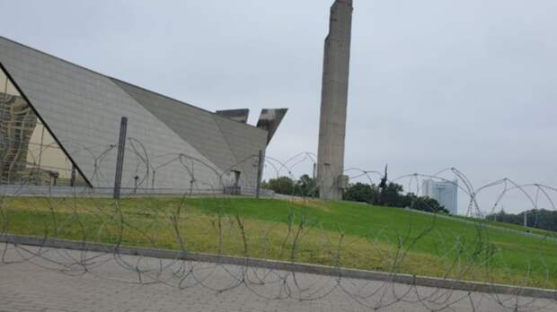 Жители Минска сообщают, что свезенные к стеле "Минск — город-герой" военные огородили монумент от протестующих мотками колючей проволоки.