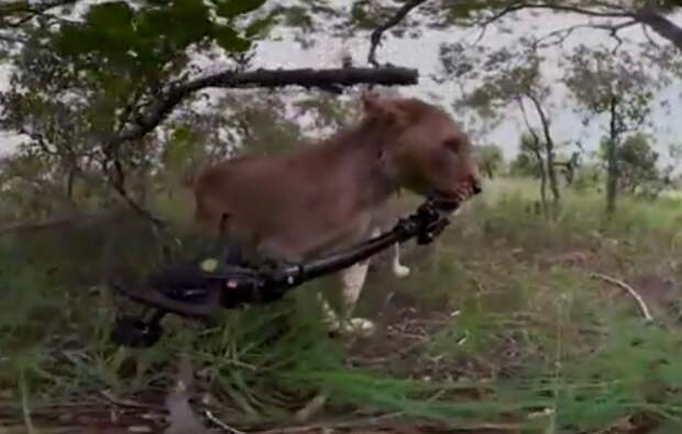 По всей видимости, голодная львица приняла видеокамеру за еду и стала кусать ее.