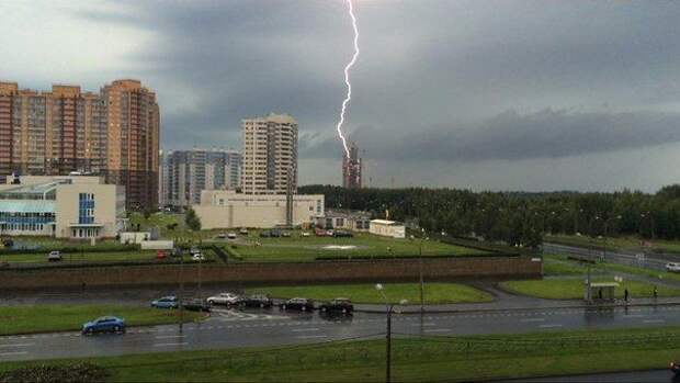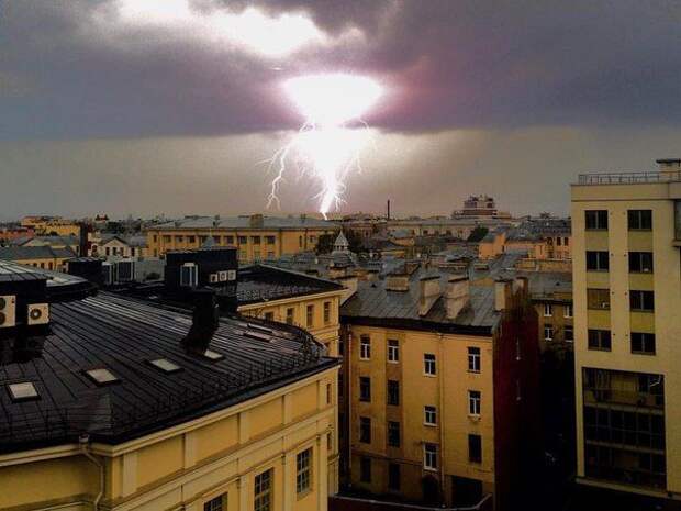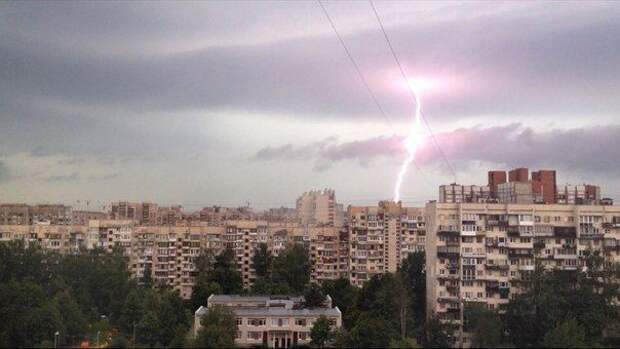 Гроза, бушевавшая на днях в Москве, пришла в Петербург. Жители города наблюдают рассекающие небо молнии. После нескольких раскатов грома на город обрушился ливень, который уже затопил дороги.