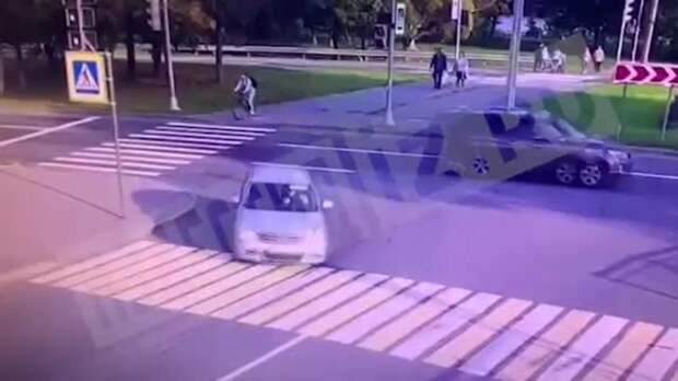 Автомобиль сбил велосипедистку на регулируемом пешеходном переходе в Санкт-Петербурге. Инцидент попал на камеры видеонаблюдения.