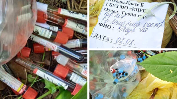 Около подмосковного города Орехово-Зуево обнаружили свалку медицинских отходов. На земле разбросаны пробирки с анализами крови пациентов лечебного учреждения.