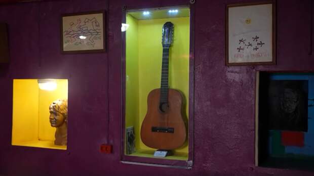 "Это коллекция нашего фонда, и в ней самая знаковая вещь – это гитара Виктора Цоя, его концертный термос, его проектор, с которым они ездили на концерты. И, наверное, стена с вырезками из газет и журналов", – продемонстрировал Алексей Сергиенко.