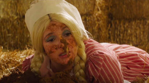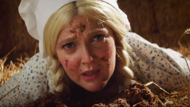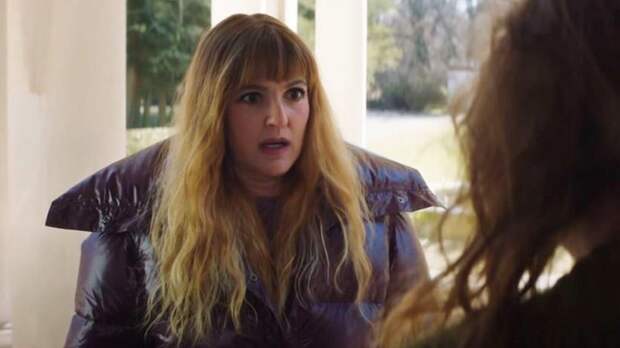 Ради роли дублерши Полы на Дрю еще и наклеили новый нос, новые зубы и волосы. Образ получился просто адовый – такой вычурно комический привет российским продавщицам из девяностых.