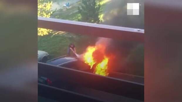 Под Челябинском во дворе дома вспыхнула иномарка. На кадрах видеозаписи, размещенной в Сети, видно, как мужчина пытается потушить загоревшееся авто, в то время как из-под капота вырывается пламя.
