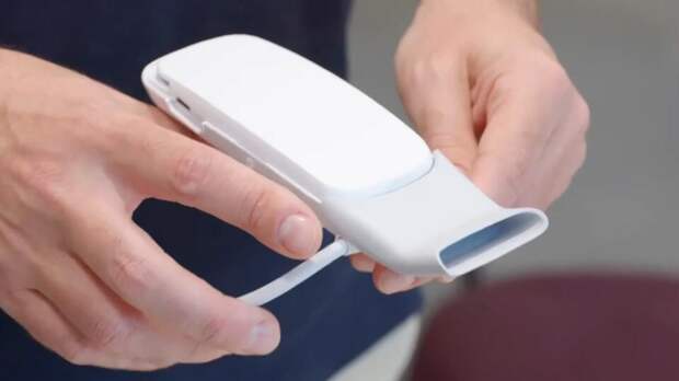 В программе показали иностранный гаджет. Он хлопает футболкой и таким образом охлаждает тело. Устройство крепится на поясе. Работает оно от простейшего аккумулятора.