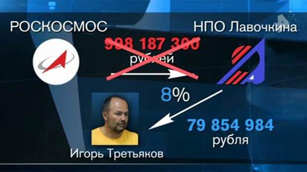 Выглядело это так. "Роскосмос" подает в суд на инженеров из-за срыва проекта "Луна-глоб". Требуют компенсацию на сумму почти в миллиард рублей. Но суд "Роскосмос" проигрывает. Результат подобных прений был предсказуем. НПО Лавочкина аргументировало, например, срыв сроков непорядочностью субподрядчиков или европейскими санкциями. За "победу" в споре адвокат Игорь Третьяков получил от НПО имени Лавочкина фантастический гонорар — 8 % от суммы, заявленной в иске. Только за то, что НПО не теряет деньги, что следствие окрестило "торговлей правосудием".