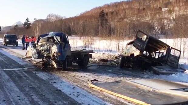 Появилось видео с места страшной аварии на трассе Южно-Сахалинск — Оха. Там скорая столкнулась с двумя фурами. От удара автомобили загорелись. Погибли двое водителей, два пациента и родственница одного из них.