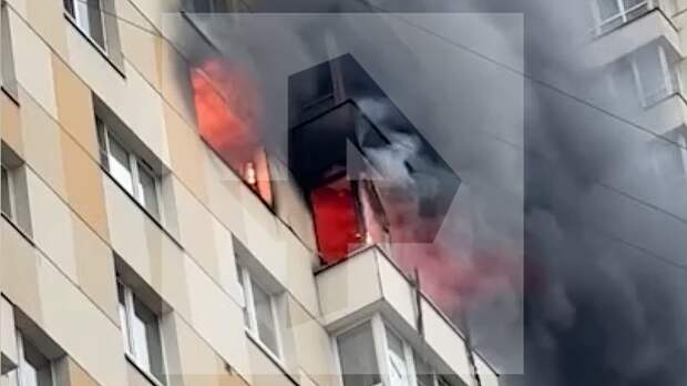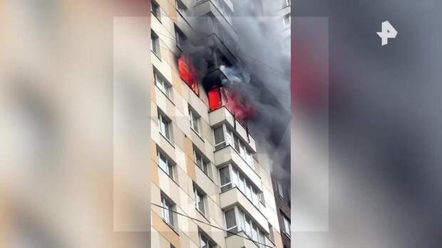На публикуемых РЕН ТВ кадрах видно, что пожар бушует на 15 этаже здания, из окон охваченной огнем квартиры вырывается черный дым.