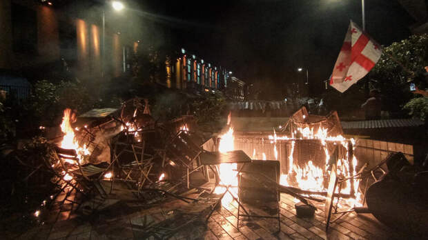 В Тбилиси митингующие подожгли ограждения, которые они сделали из стульев и столов из ресторана для защиты от спецназа.