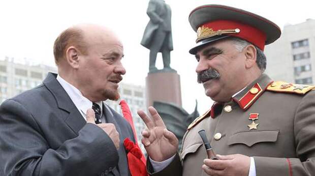 Игорь Горбунов (мужчина работает двойником Ленина) на Манежной площади встретил Латифа Валиева (двойника Сталина).