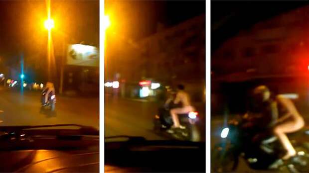 На кадрах видно, как по ночному городу едет мотоцикл. За спиной водителя сидит обнаженная девушка, которая постоянно привстает и, не держась, машет руками.