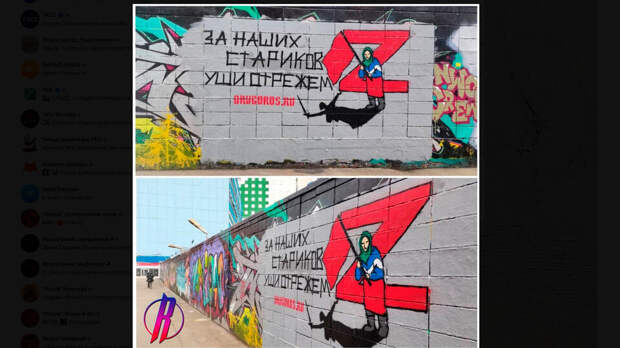 На стрит-арте изображена бабушка с красным флагом. На фоне – красный символ Z и надпись "За наших стариков уши отрежем". Фигура старушки отбрасывает черную тень в виде силуэта монумента "Родина-мать зовет!".Граффити появилось рядом со станцией метро "Менделеевская". На стрит-арте изображена бабушка с красным флагом. На фоне – красный символ Z и надпись "За наших стариков уши отрежем". Фигура старушки отбрасывает черную тень в виде силуэта монумента "Родина-мать зовет!".