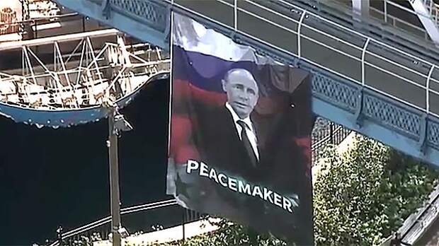 Видео, снятое с высоты птичьего полета, на котором запечатлен баннер с портретом президента России Владимира Путина и подписью "Миротворец", появилось в Сети.