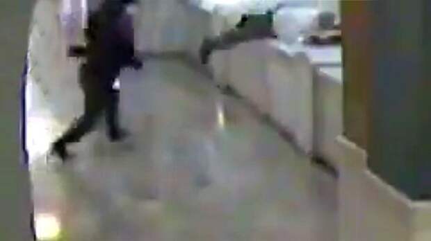 На записи видно, как подсудимый в сопровождении двух конвоиров идет по коридору, однако внезапно он бросается к перилам и падает.