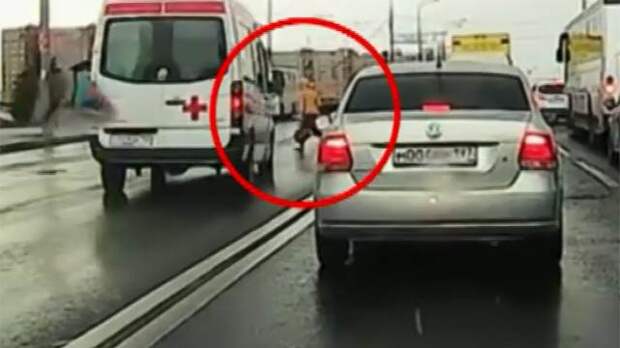 В Москве женщина так спешила сесть в автобус, что чуть не попала под колеса скорой помощи. Спецавтомобиль на высокой скорости объезжает затор по встречной полосе. Неожиданно из-за машин наперерез выскакивает пешеход.