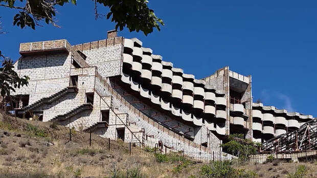 Подробности раскрыл корреспондент РЕН ТВ Олег Зайковский.13-ти этажное здание каскадами спускающееся к морю, в котором должна была отдыхать партийная элита. Но распад Советского Союза поставил крест на перспективах огромного санаторного комплекса с поэтичным названием "Лазурный берег".