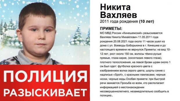 Просьба ко всем, кто располагает информацией о местонахождении ребенка, сообщить в полицию по телефонам 8 (49331) 54664, 55713, 8999-056-02-99, 02, 102.