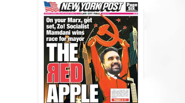 Нью-Йорк в шутку называют "большим яблоком" уже больше 100 лет. Популяризаторами словосочетания стали джазовые музыканты и туристические компании. Слово "красный" на обложке The New York Post символизирует левые взгляды Мамдани.