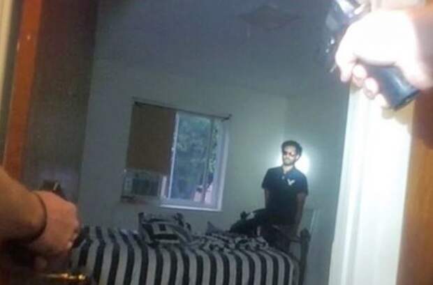 На кадрах видеозаписи видно, что мужчина стоит у кровати в углу комнаты и не отвечает на вопросы сотрудников правопорядка.