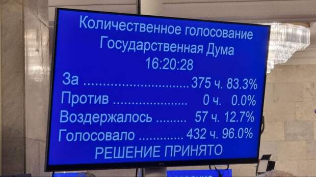 Как следует из протокола голосования, за назначение Мишустина выступили 375 депутатов. Воздержались 57 человек, никто не проголосовал против.