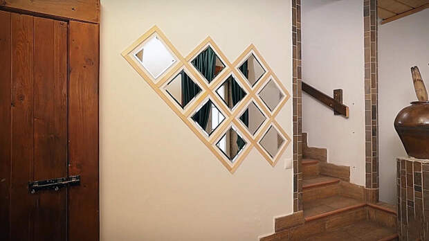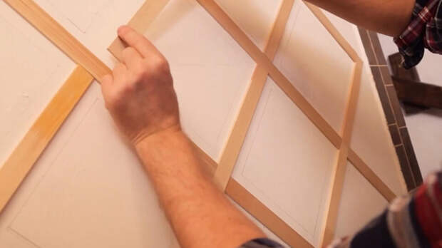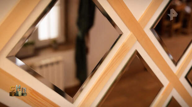 Кадр из программы "Самая народная программа", РЕН ТВ Итак, чертим на стене горизонтальную линию и от нее размечаем схему укладки плитки. Между зеркалами оставляем зазор 7 см. Замеряем длину наклонных линий и распиливаем по этим меркам тонкие рейки. Приклеиваем их на стену по разметке. Если рейки не хватает на всю длину, стыкуем короткие детали. В центр каждого ромба вклеиваем зеркальную плитку.