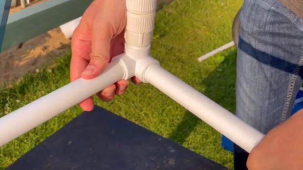 Видео с идеей прислал наш телезритель Антон Лозовой. Мастер нарезал полипропиленовые трубы на четыре детали. С помощью паяльника для пластиковых труб, двухплоскостных тройников и комбинированных фитингов собрал квадратную основу. По центру одной из граней мастер врезал комбинированный тройник со внешней резьбой. Загерметизировал ее с помощью ленты, установил шаровый кран. И прикрутил к нему пластиковый переходник для шланга.