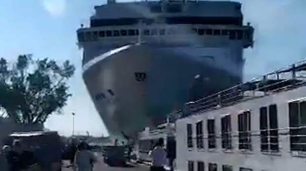 В Венеции очевидцы сняли на видео, как круизный лайнер MSC Opera протаранил туристическое прогулочное судно River Countess, на борту которого находилось около 130 человек.