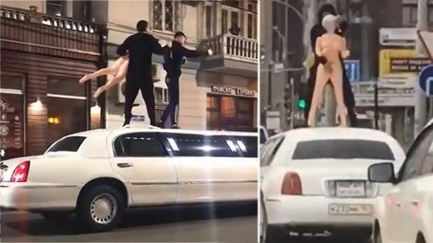 На кадрах запечатлено, как молодые люди ездят по городу. В какой-то момент они даже вышли на крышу авто. "Аксессуаром" громкой компании, при этом, стала резиновая секс-кукла.