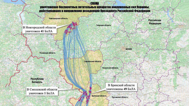 "Нанесение удара противником, как показано на представленной карте, осуществлялось по нескольким направлениям к резиденции Президента России над территориями Брянской, Смоленской, Тверской и Новгородской областей", – сказал он.