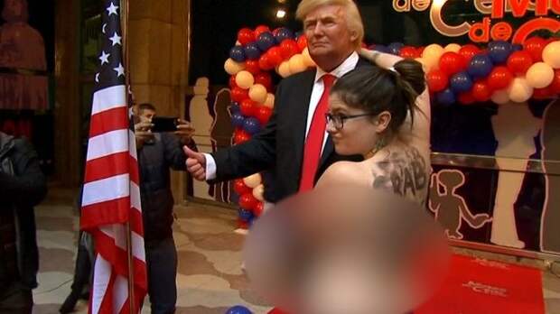Активистка Femen c голой грудью набросилась на восковую фигуру избранного президента США Дональда Трампа в Мадриде. Женщину не могли поймать несколько минут.