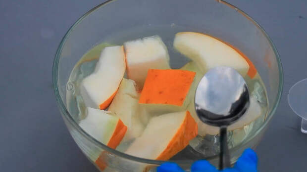 "Вода совершенно прозрачная, пленка сверху не образуется, цвет вода не меняет. Можно взять, выловить один кусочек и провести по влажной поверхности кожуры пальцем. Никаких следов посторонних продуктов на дыне нет", – поделился подробностями Виктор Клочков.