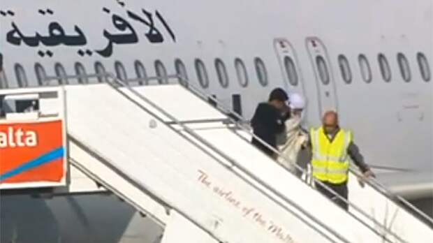 СМИ публикуют видео вывода заложников из захваченного пассажирского ливийского самолета, который приземлился на Мальте.