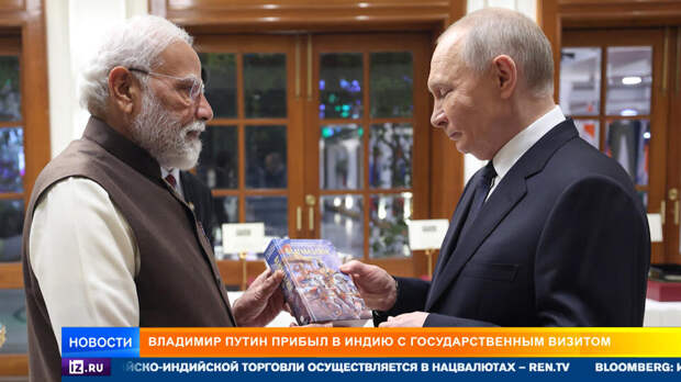 Какое значение сами индийцы придают этому визиту – говорят особые знаки уважения – Моди лично приехал встречать Путина прямо у трапа самолета. И подарил российскому лидеру копию древнеиндийских текстов "Бхагавадгита" на русском языке. Из Нью-Дели передает корреспондент Николай Иванов, подробности – в сюжете РЕН ТВ.Авиабаза Палам – старейшая в Дели. Ил-96 российского лидера приземлился, государственный визит Владимира Путина – начинается. Индийский премьер заранее приехал на авиабазу, чтобы встретить Владимира Путина. Это вообще не по протоколу. Просто лидеры наших стран – давние друзья. Трап пристыковывается к фюзеляжу, подъехали кортежи, из одного из автомобилей выходит премьер Индии Нарендра Моди. Долгое рукопожатие и дружеские объятия.