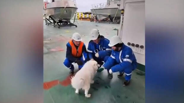 Собака нашлась в заливе Обская губа на Ямале. Сотрудники спустили пожарный трап, по которому собака сама взобралась на борт.