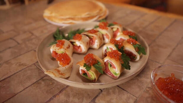 Пока остывают блины, нарезаем тонкими ломтиками авокадо и слабосоленый лосось. Смазываем половину остывшего блина творожным сыром. Сверху выкладываем ломтики рыбы, затем авокадо и аккуратно сворачиваем в рулет. Готовое блюдо нарезаем поперек и украшаем красной икрой и зеленью.