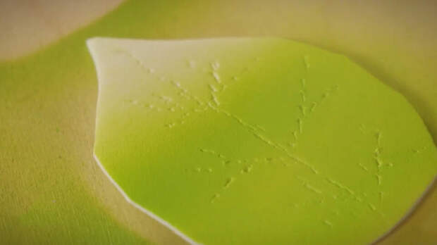 Нарезаем материал на квадраты разных размеров. И из каждого вырезаем лепесток, скругляем три края из четырех. С помощью строительного фена формируем на лепестках изгибы. Из обрезков изолона вырезаем листья будущего цветка. Обычным карандашом делаем тиснение – создаем текстуру листа. Красим заготовки в зеленый цвет.